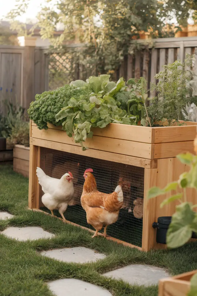 Tip: Keep your garden bed above the coop or on one end, and plant fast-growing greens your chickens can nibble on.
