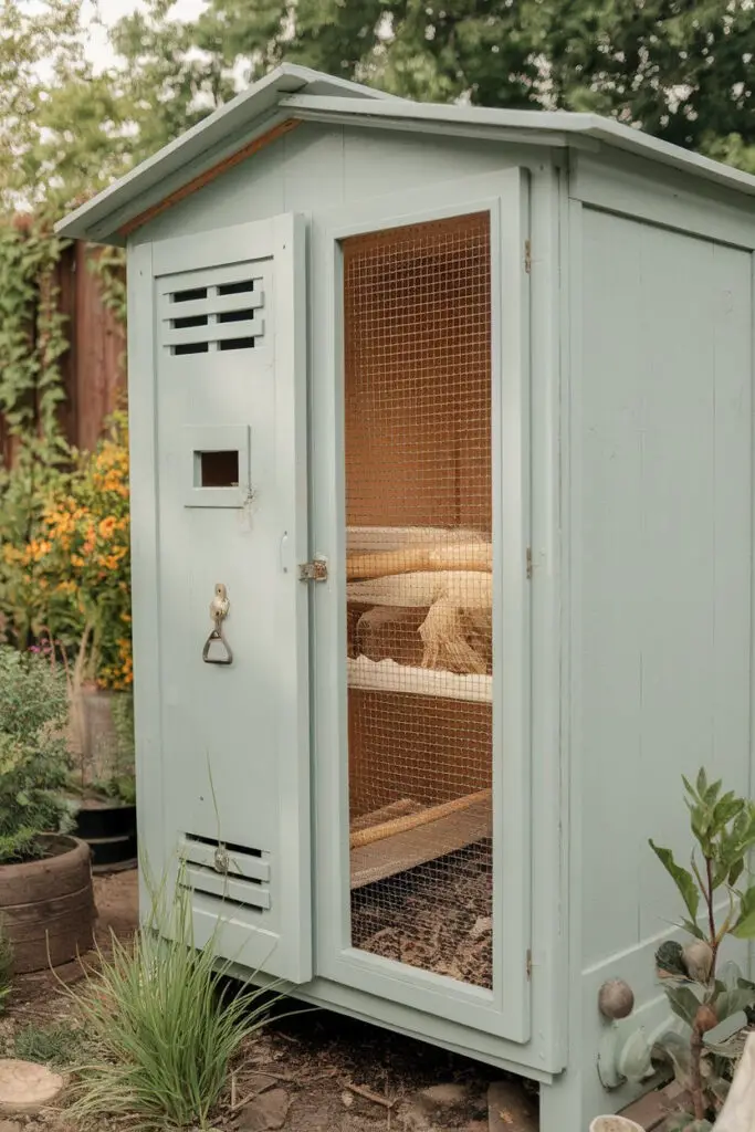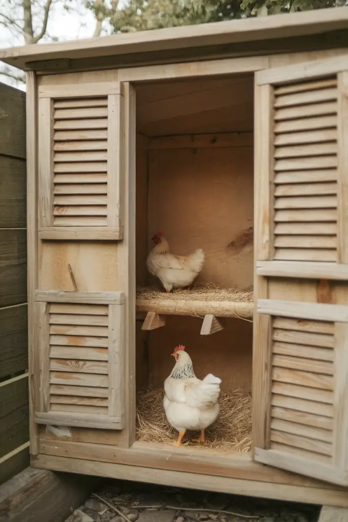 Got an old wooden wardrobe or closet cabinet collecting dust in the garage? Don’t trash it—transform it. Cut out a few windows, add a door latch and some ventilation, and you’ve got a super cozy coop for 2–3 hens.