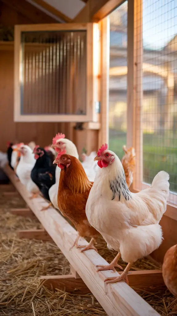 Plan for 8 to 12 inches of roosting space per bird. Got 10 chickens? You’ll need at least 8–10 feet of total roost bar. And a little extra never hurts, especially if someone in the flock’s a drama queen and likes to peck at her neighbors.