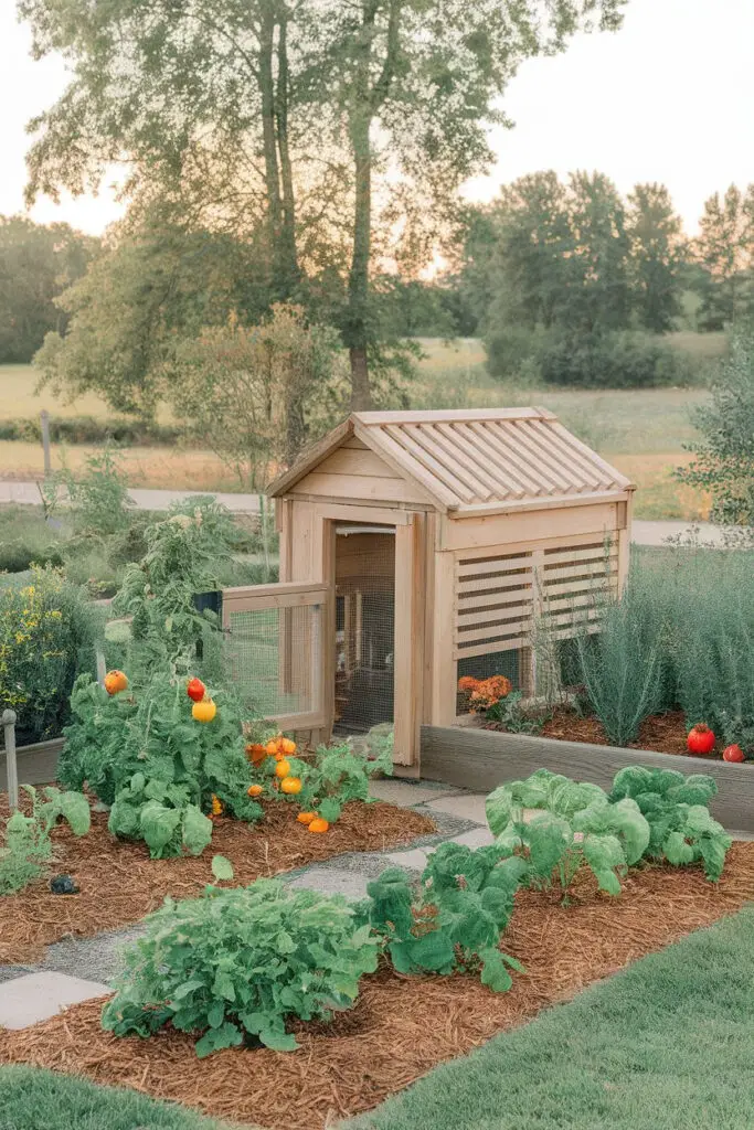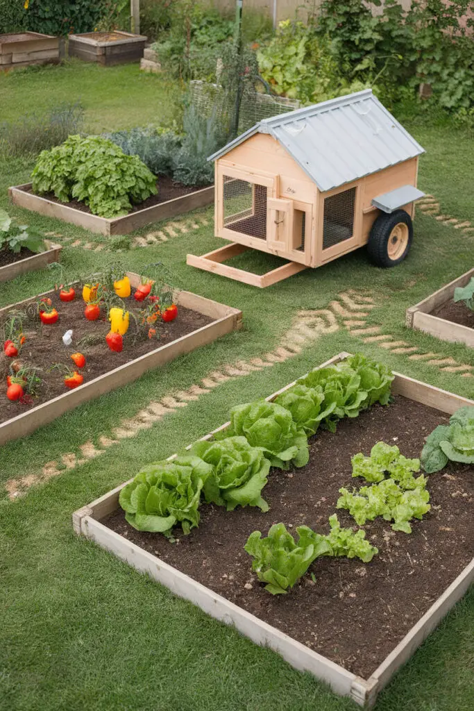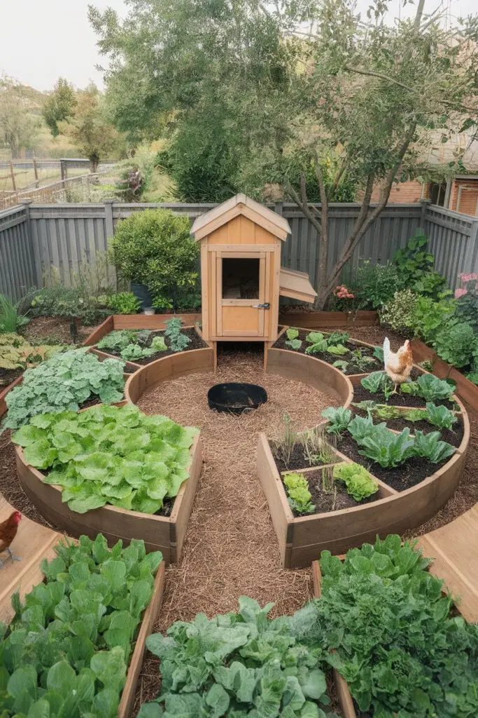 Place the chicken coop in the center of your garden with paths or beds radiating outward like spokes on a wheel.