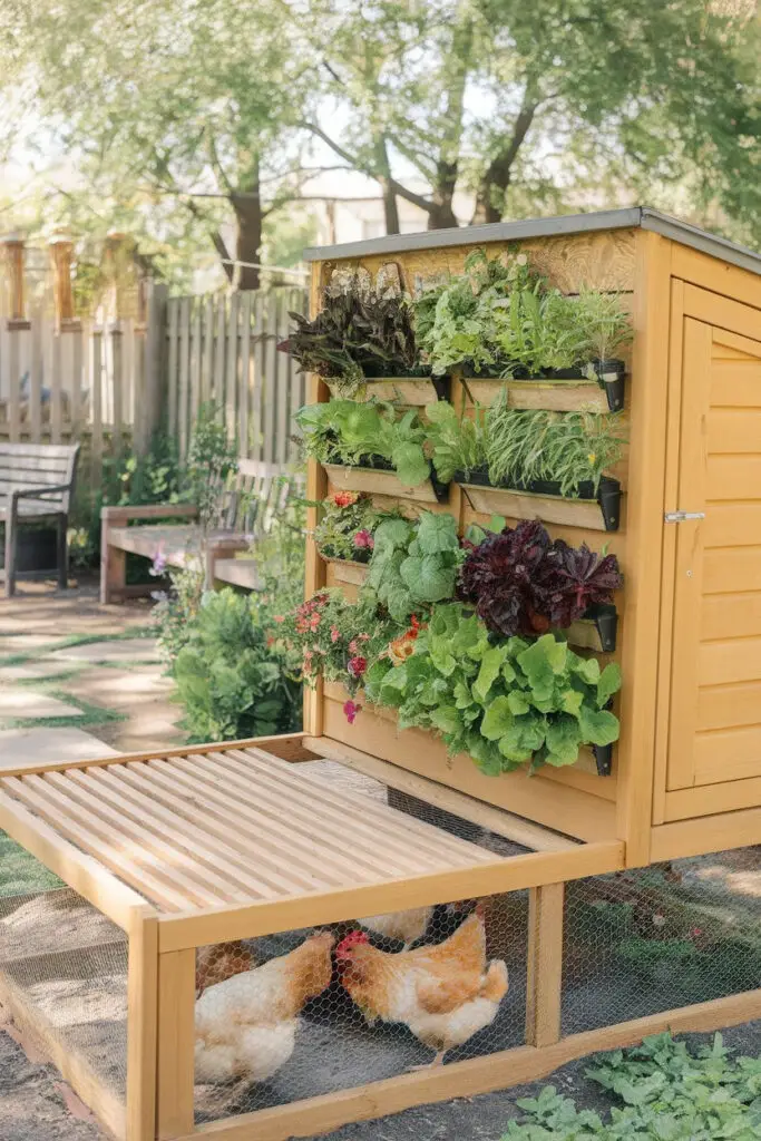 Attach planters or trellises to the coop exterior to grow herbs, strawberries, or flowers vertically.