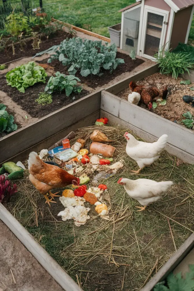 Designate a garden corner as your chicken-powered compost area. Toss kitchen scraps, bedding, and yard waste in, and let the chickens do the turning.