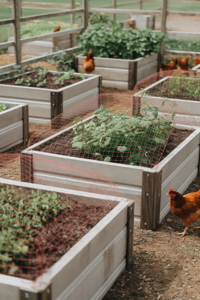 Set up raised garden beds with chicken-proof mesh or netting that can be lifted when your plants are mature. It’s like giving your plants a high-security fence, but for chickens. It’s a bit like putting them in a chicken-free spa—peaceful and untouched.